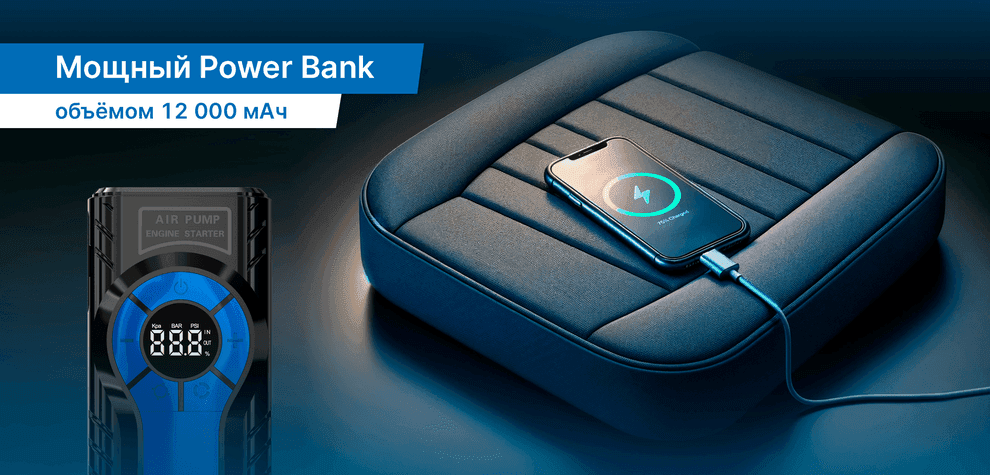 Универсальный (4 в 1) гаджет: пуско-зарядное устройство, компрессор, powerbank, фонарь. Ёмкость аккумулятора: 12 000 мАч