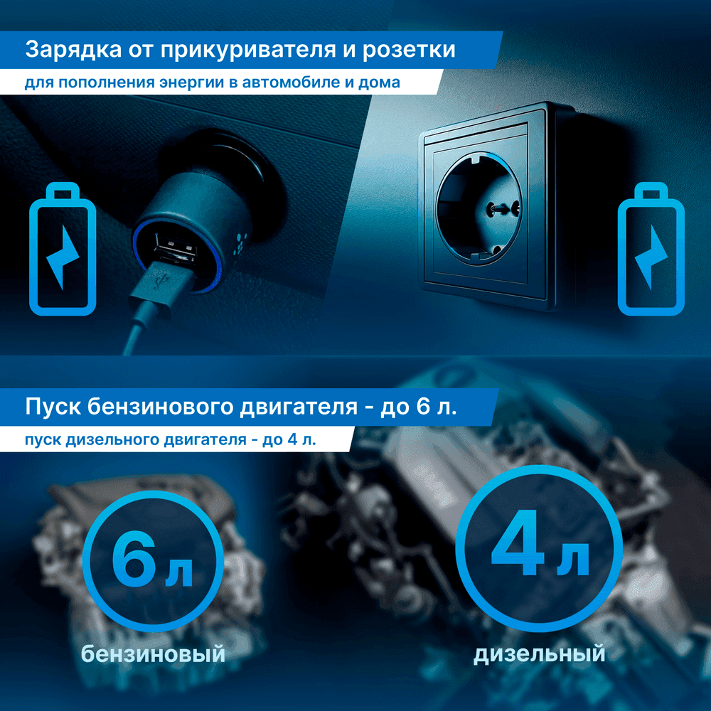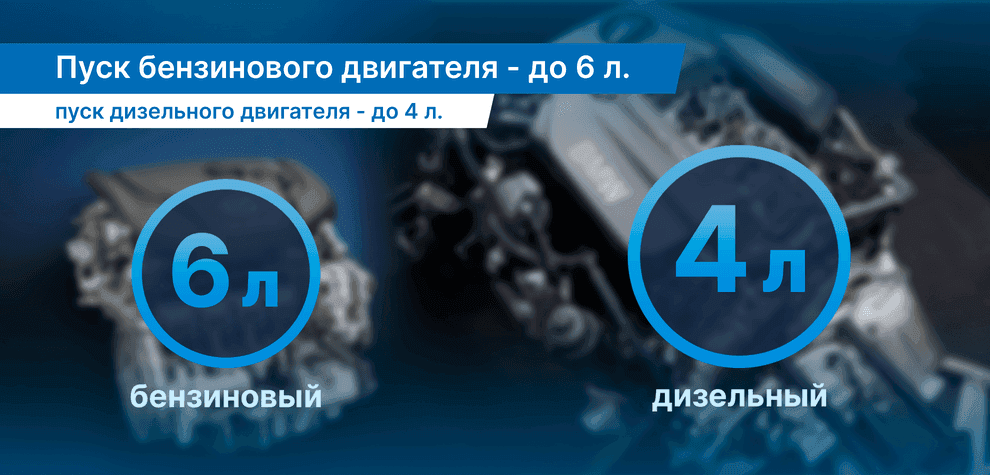 - Пуск бензинового двигателя до 6 л. и дизельного до 4 л.