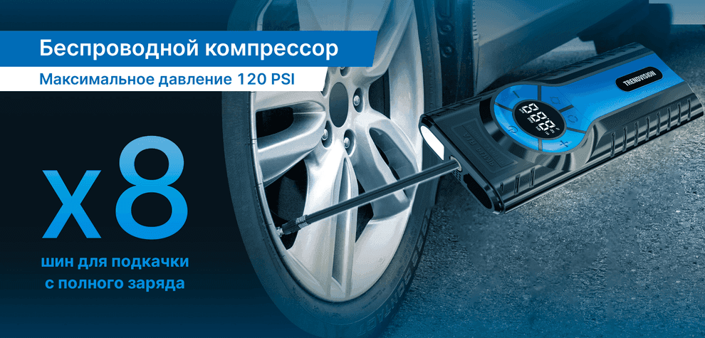 Обеспечивает давление до 120 PSI, позволяя подкачать до 8 автомобильных шин на одном заряде, что гарантирует независимость от внешних источников питания при поддержании оптимального давления в шинах.
