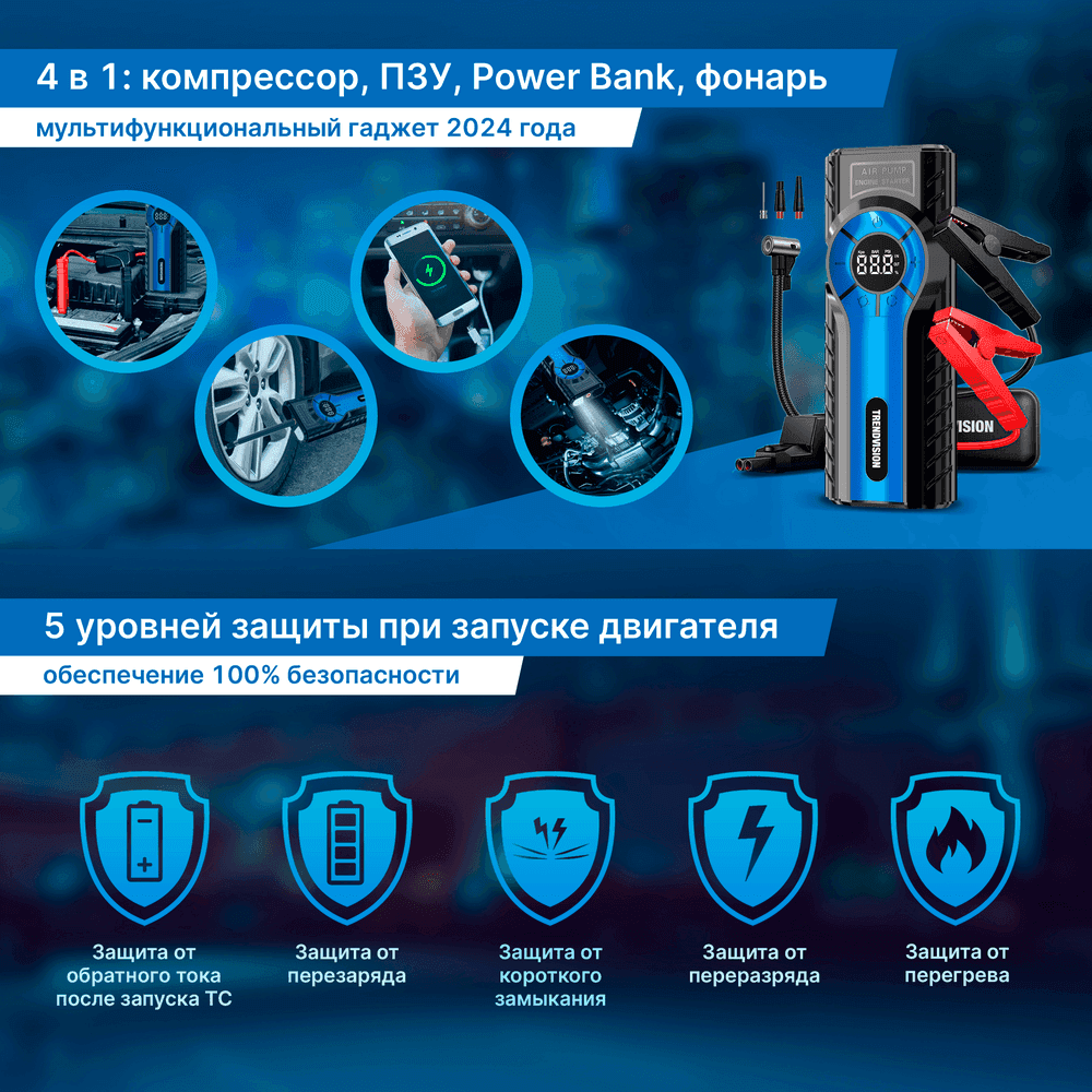 Универсальный (4 в 1) гаджет: пуско-зарядное устройство, компрессор, powerbank, фонарь. Ёмкость аккумулятора: 16 000 мАч. Поддержка быстрой зарядки 30 Ватт.
