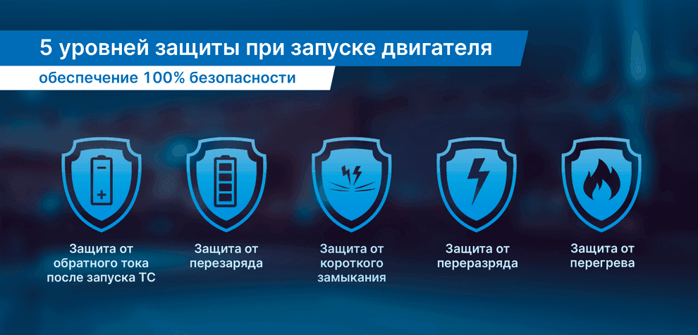 Пять уровней защиты минимизируют риски повреждения электрической системы автомобиля или устройства, включая защиту от короткого замыкания, перегрузки, перенапряжения, перегрева и обратной полярности.
