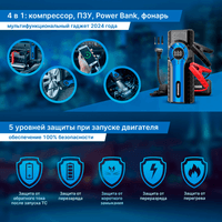 Универсальный (4 в 1) гаджет: пуско-зарядное устройство, компрессор, powerbank, фонарь. Ёмкость аккумулятора: 16 000 мАч. Поддержка быстрой зарядки 30 Ватт.