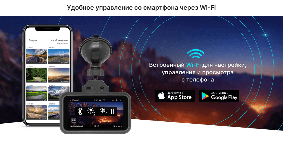 Аппарат оснащён встроенным Wi-Fi-модулем, который позволяет управлять устройством (настройка, запись и просмотр видео) прямо с мобильного телефона. Удобное приложение «TV Connect», созданное специально под аппараты TrendVision, можно скачать в App Store и Google Play. Помимо прочего, прямо из приложения можно обновлять базы данных SpeedCam и прошивки. (Подключение к приложению на смартфоне осуществимо только от оригинального зарядного устройства или зарядного устройства с параметрами заявленными в характеристиках).