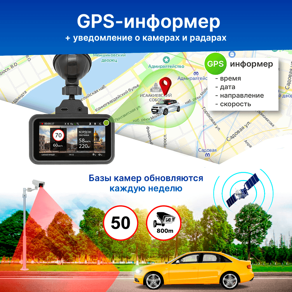 Синхронизация GPS с единой базой дорожных предупреждений «SpeedCam» обеспечит актуальной информацией о камерах контроля скорости ГИБДД, постах ДПС, радарах и других «опасностях» на дороге. При приближении к устройству контроля авторегистратор подаст звуковой сигнал и выведет оповещение о действующем ограничении на дисплее. Также, на дисплее будет указываться ваша текущая скорость и расстояние до камеры или радара.