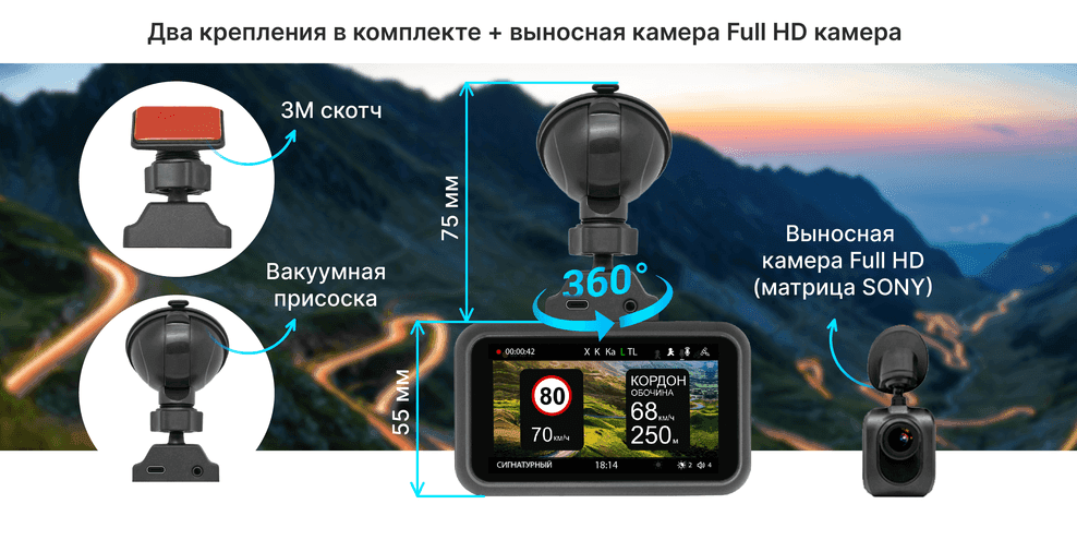 В комплекте предлагается задняя камера и два варианта кронштейна – с установкой на 3М скотче и на вакуумной присоске.