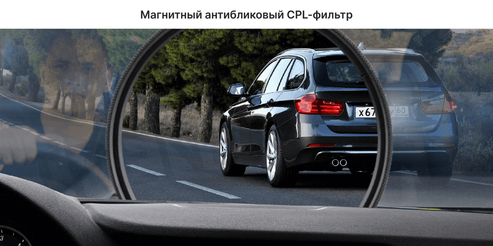 В комплекте c устройством имеется магнитный антибликовый CPL-фильтр, который является незаменимым инструментом для подавления отражений. Он исключает блики / засвечивания от солнца и отражения на лобовом стекле автомобиля, повышая «чистоту» картинки и детальность фиксации дорожных событий
