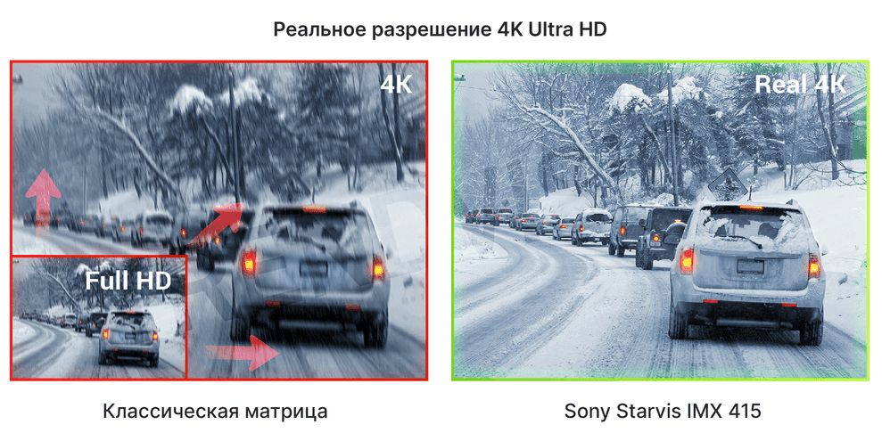 Аппарат оснащён матрицей SONY STARVIS IMX415 – одной из лучших на рынке авторегистраторов на 2023 год! Устройство снимает в реальном разрешении 4K Ultra HD, без интерполяции. Качество картинки достигает той степени, при которой днём и ночью, в дождь и солнце, аппарат не теряет ни единой детали происходящего на дороге – всегда четко видны номера машин, знаки дорожного движения и даже, в отдельных случаях, лица людей. При 2-канальной съёмке, разрешение становится 2К + Full HD.
