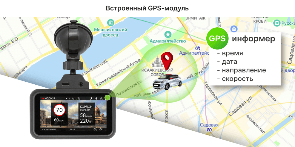 Синхронизация GPS с единой базой дорожных предупреждений «SpeedCam» обеспечит актуальной информацией о камерах контроля скорости ГИБДД, постах ДПС, радарах и других «опасностях» на дороге. При приближении к устройству контроля авторегистратор подаст звуковой сигнал и выведет оповещение о действующем ограничении на дисплее. Также, на дисплее будет указываться ваша текущая скорость и расстояние до камеры или радара.