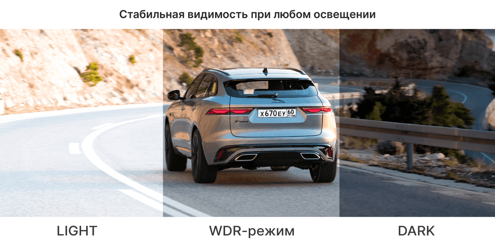 TrendVision TDR-725 Real 4K Max оснащен функцией расширения динамического диапазона WDR, обеспечивающей сбалансированное изображение в сложных условиях освещения: при встречных фарах, прямых солнечных лучах и выезде из туннеля.