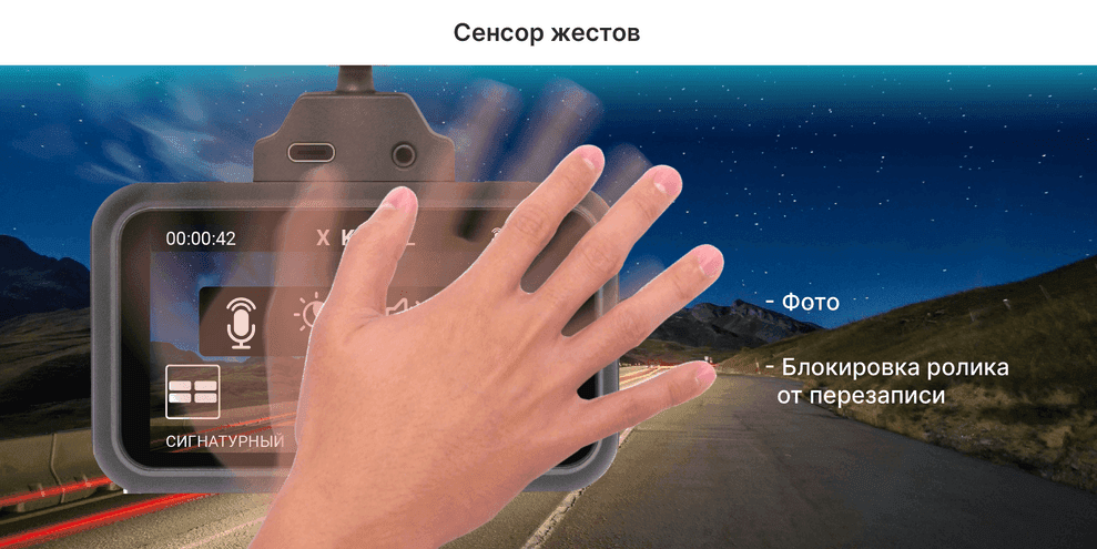 TrendVision TDR-725 Real 4K Max оснащён высокочувствительным сенсором жестов, благодаря которому есть возможность одним взмахом руки перед аппаратом сделать фото или заблокировать текущий ролик от перезаписи.