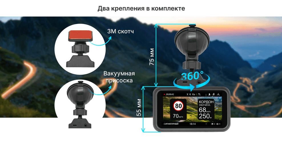 В комплекте предлагается два варианта кронштейна – с установкой на 3М скотче и на вакуумной присоске.