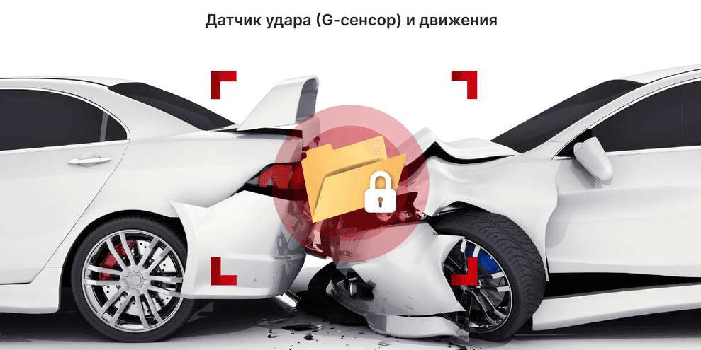 Аппарат оснащён датчиками, которые, даже при малейшем ударе или опасном движении в кадре, автоматически сохраняют записанный видеоролик в нестираемую область памяти. Благодаря этому важные для разрешения ДТП или кражи данные будут всегда защищены от перезаписи или удаления.