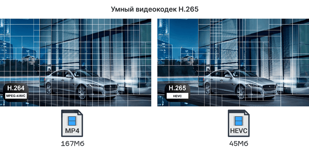 - Современный умный кодек H.265 (меньший объем файлов)