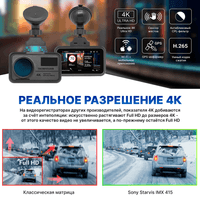 Аппарат оснащён матрицей SONY STARVIS IMX415 – одной из лучших на рынке авторегистраторов на 2025 год! Устройство снимает в реальном разрешении 4K Ultra HD, без интерполяции. Качество картинки достигает той степени, при которой днём и ночью, в дождь и солнце, аппарат не теряет ни единой детали происходящего на дороге – всегда четко видны номера машин, знаки дорожного движения и даже, в отдельных случаях, лица людей.