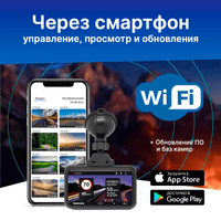 Аппарат оснащён встроенным Wi-Fi-модулем, который позволяет управлять устройством (настройка, запись и просмотр видео) прямо с мобильного телефона. Удобное приложение «TV Connect», созданное специально под аппараты TrendVision, можно скачать в App Store и Google Play. Помимо прочего, прямо из приложения можно обновлять базы данных SpeedCam и прошивки. (Подключение к приложению на смартфоне осуществимо только от оригинального зарядного устройства или зарядного устройства с параметрами заявленными в характеристиках).