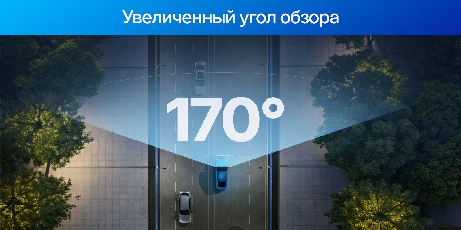Объектив с углом обзора 170° фиксирует не только пространство прямо перед автомобилем, но и всю ширину проезжей части вместе с пешеходной зоной. Это позволяет максимально полно отразить действия других участников движения в случае ДТП. Камера охватывает более четырёх полос дороги, поэтому на записи может оказаться и авария, произошедшая рядом, что поможет другим водителям, у которых нет регистратора.