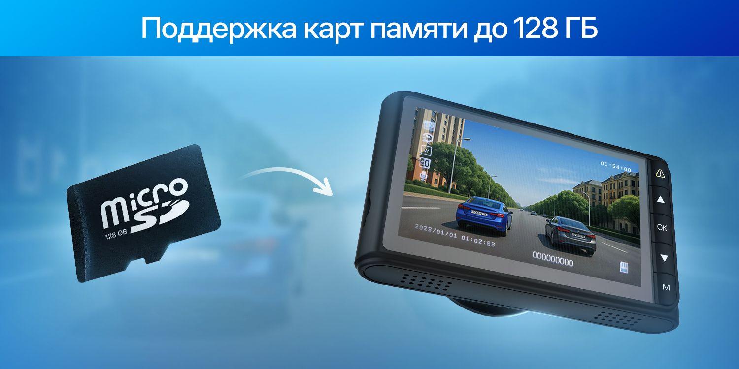 Видеорегистратор совместим с картами памяти объёмом до 128 ГБ, чего достаточно для хранения примерно суток непрерывных записей. После заполнения накопителя устройство автоматически включает циклическую перезапись, заменяя старые файлы новыми и обеспечивая непрерывную фиксацию дорожной обстановки.