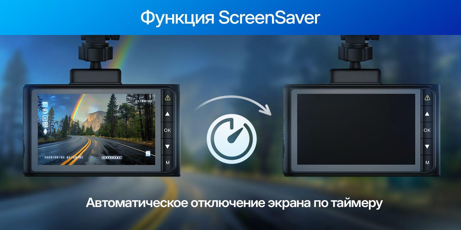 В устройстве предусмотрена функция ScreenSaver, позволяющая настроить таймер автоматического отключения дисплея. Когда экран гаснет, он не отвлекает водителя и не создаёт лишней яркости в тёмное время суток, при этом видеорегистратор продолжает вести запись в обычном режиме.