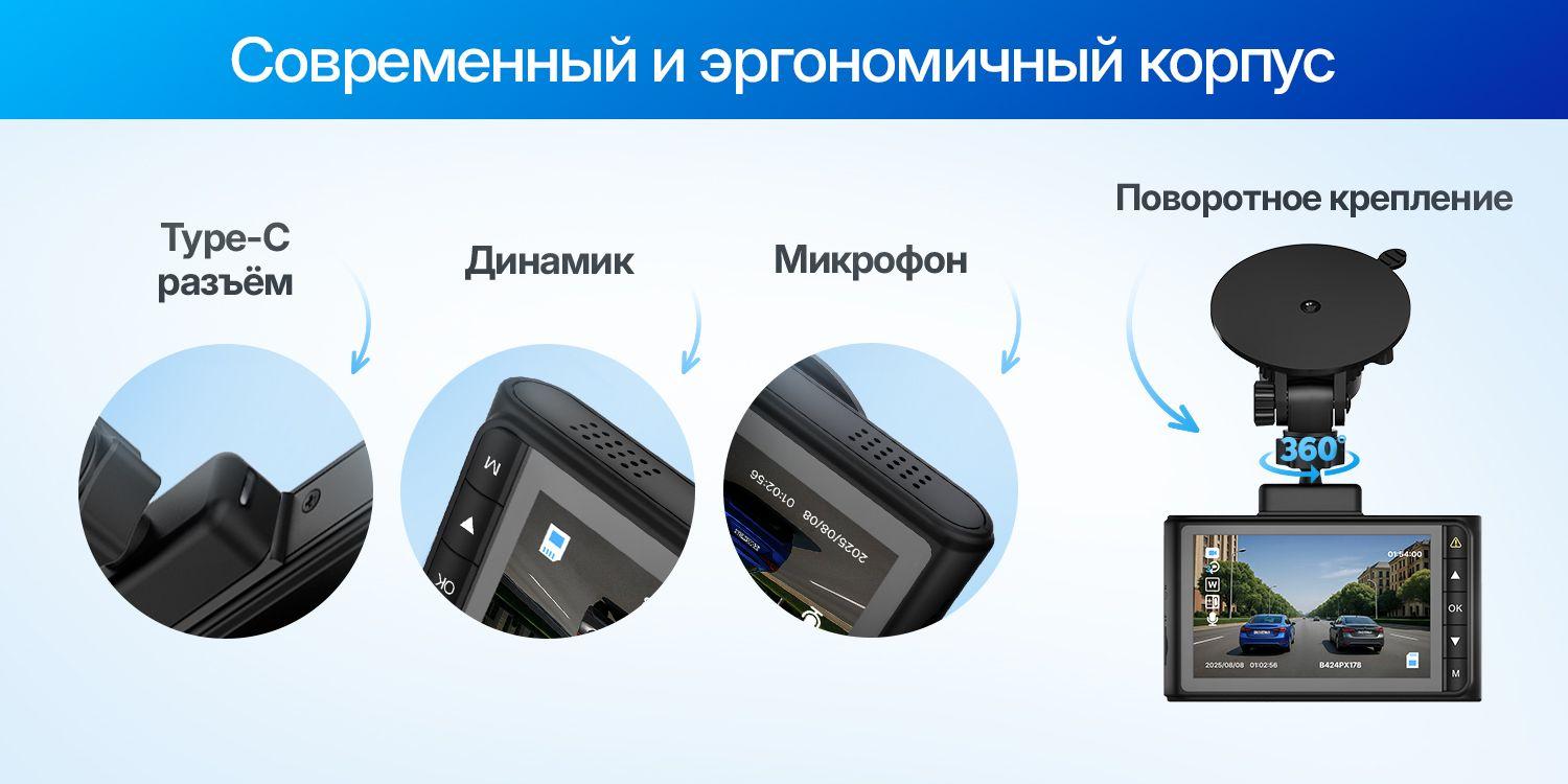 Видеорегистратор отличается компактными размерами, благодаря чему он практически не закрывает обзор дороги и не мешает водителю во время движения. Устройство оснащено современным разъёмом Type-C для удобного подключения, а встроенные микрофон и динамик позволяют записывать и воспроизводить звук в салоне. Поворотное крепление на 360° обеспечивает свободу обзора: регистратор можно в любой момент развернуть в нужную сторону, например, направить на сотрудника ДПС при общении.