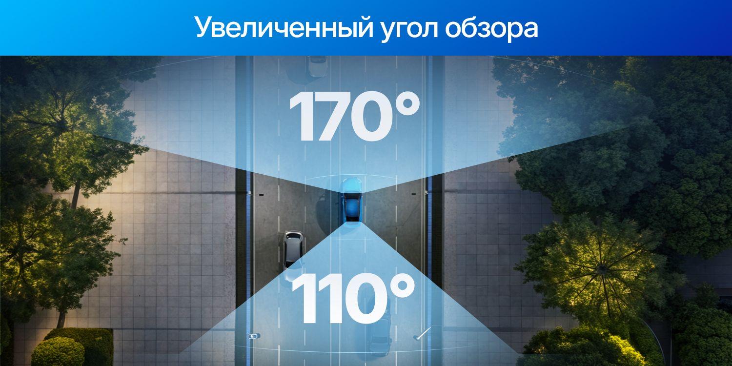 Передняя камера с углом обзора 170° и задняя с углом 110° фиксируют не только пространство перед и позади автомобиля, но и всю ширину проезжей части вместе с пешеходной зоной. Такой охват позволяет максимально полно отразить действия участников движения при ДТП. Объектив способен захватить более четырёх полос дороги, поэтому на записи может оказаться и авария, произошедшая рядом, что поможет другим водителям, у которых регистратора нет.