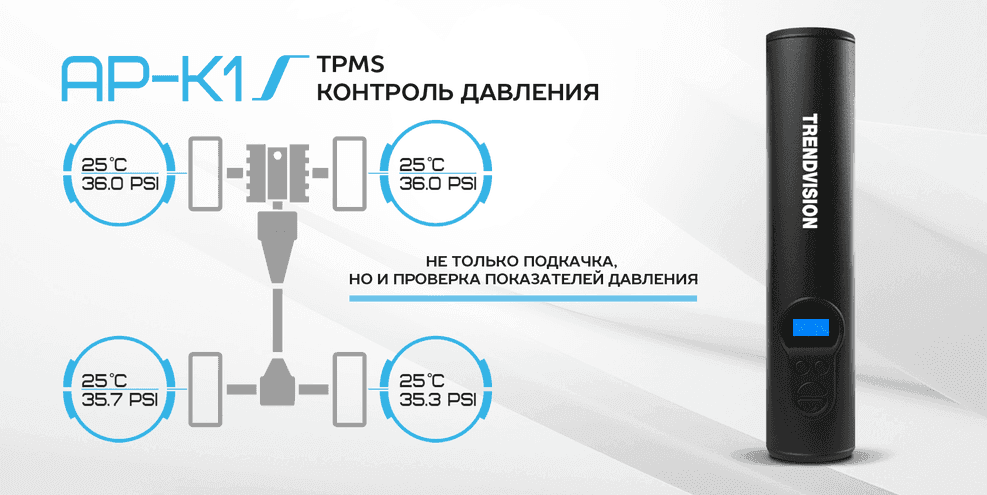 Одной из полезных функций в компрессоре TrendVision AP-K1 является система контроля давления в шинах (TPMS). Чтобы проверить давление в шине, необходимо всего лишь присоединить компрессор к шине. Давление автоматически высветится на цифровом дисплее (при условии, что компрессор включен).