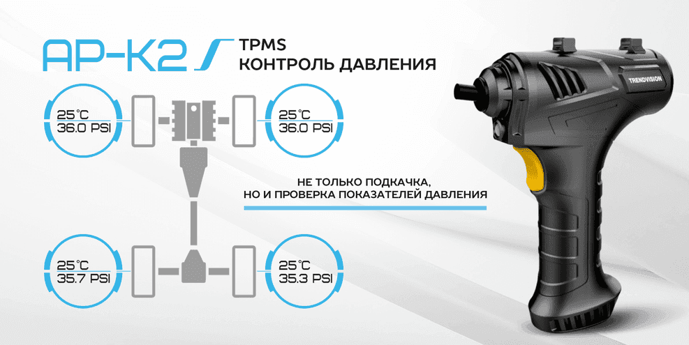 Одной из полезных функций в компрессоре TrendVision AP-K2 является система контроля давления в шинах (TPMS). Чтобы проверить давление в шине, необходимо всего лишь присоединить компрессор к шине. Давление автоматически высветится на цифровом дисплее (при условии, что компрессор включен).