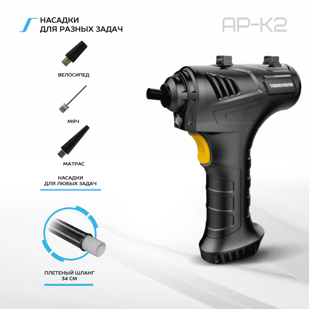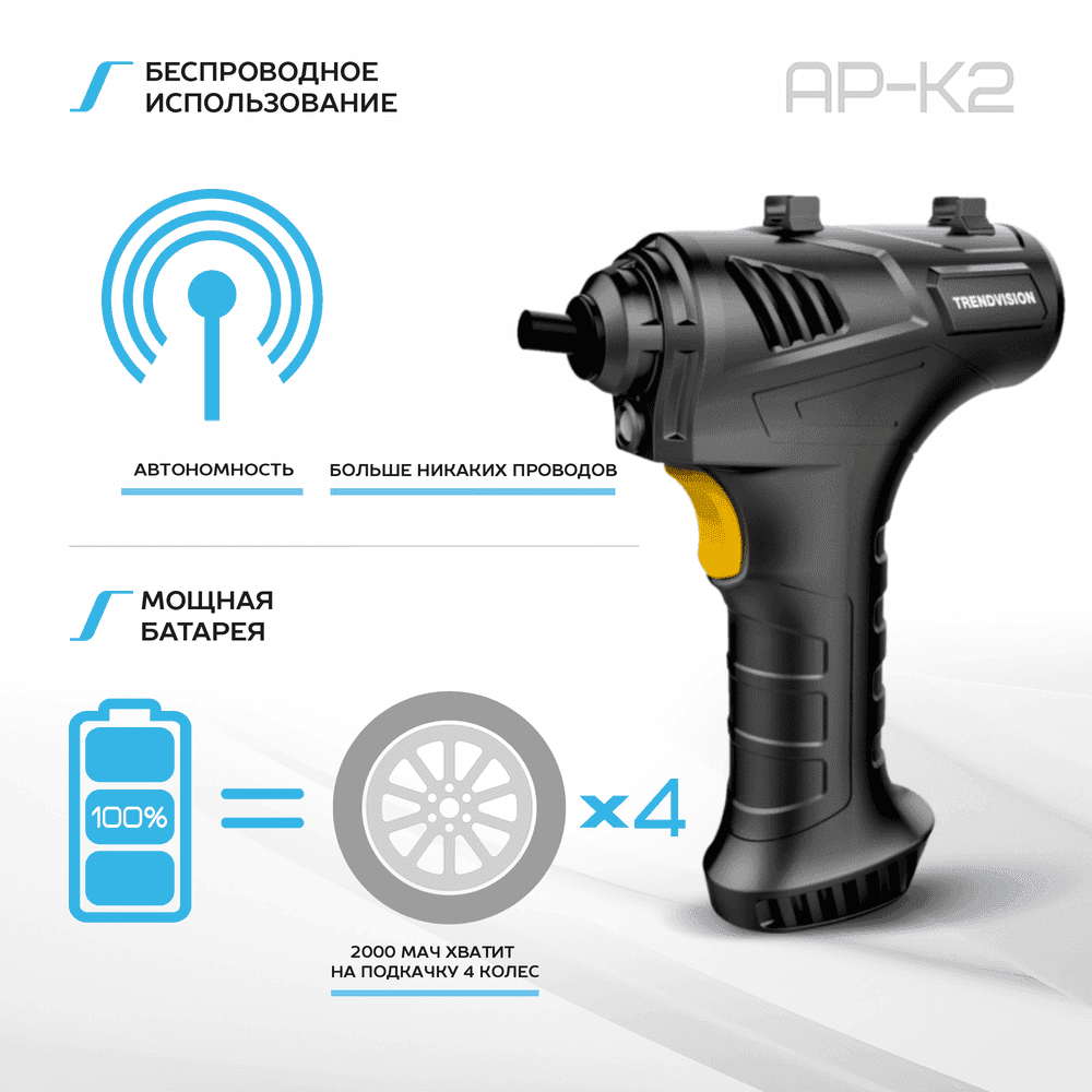 TrendVision AP-K2 - это беспроводной портативный автомобильный компрессор, мощностью 50 Вт, с батареей емкостью 2000 мАч и автоматическим выключением по достижении заданного давления. Максимальное давление выдаваемое компрессором - 150 PSI или 10 BAR. Компрессор оснащен LED фонарем и LCD дисплеем для более точных показаний.