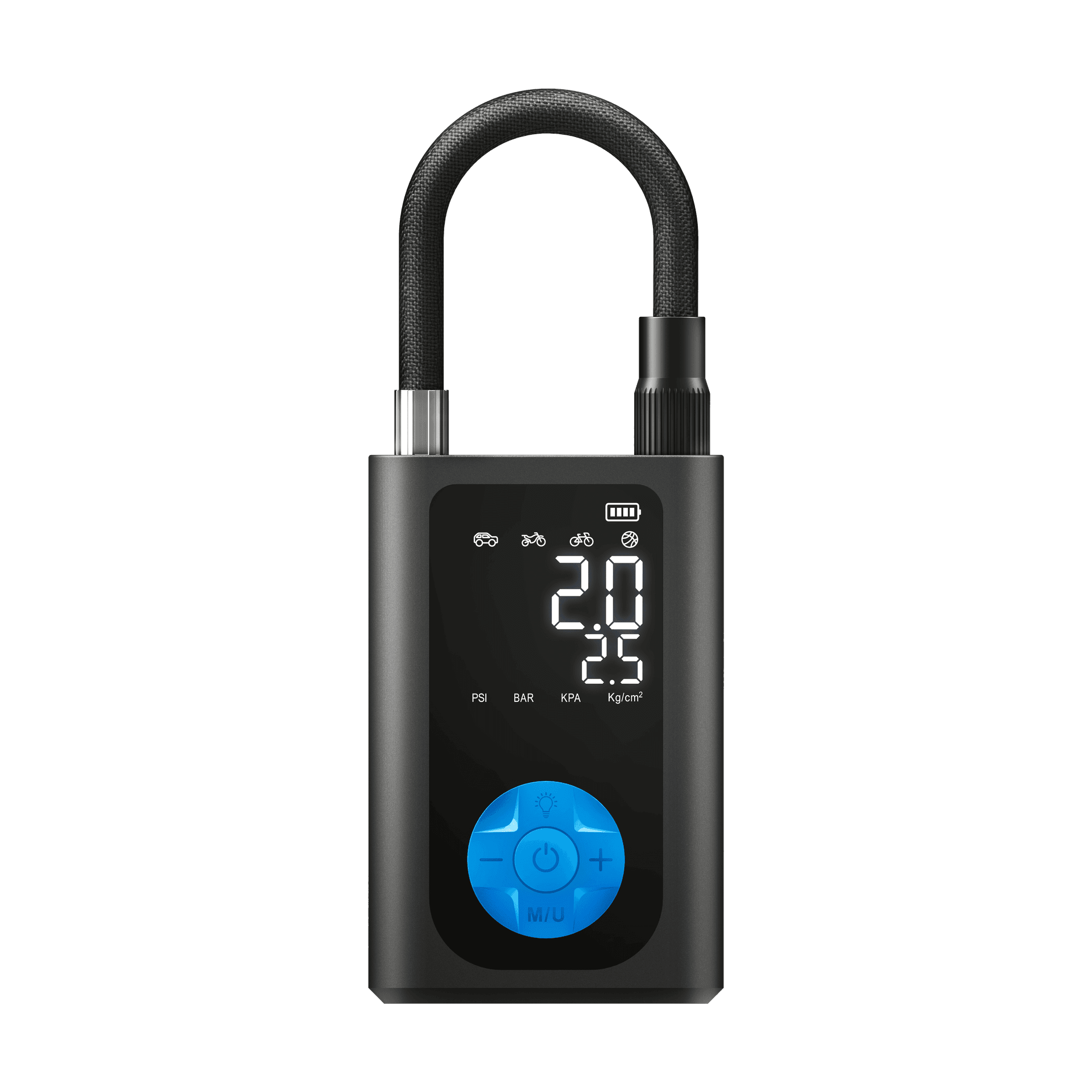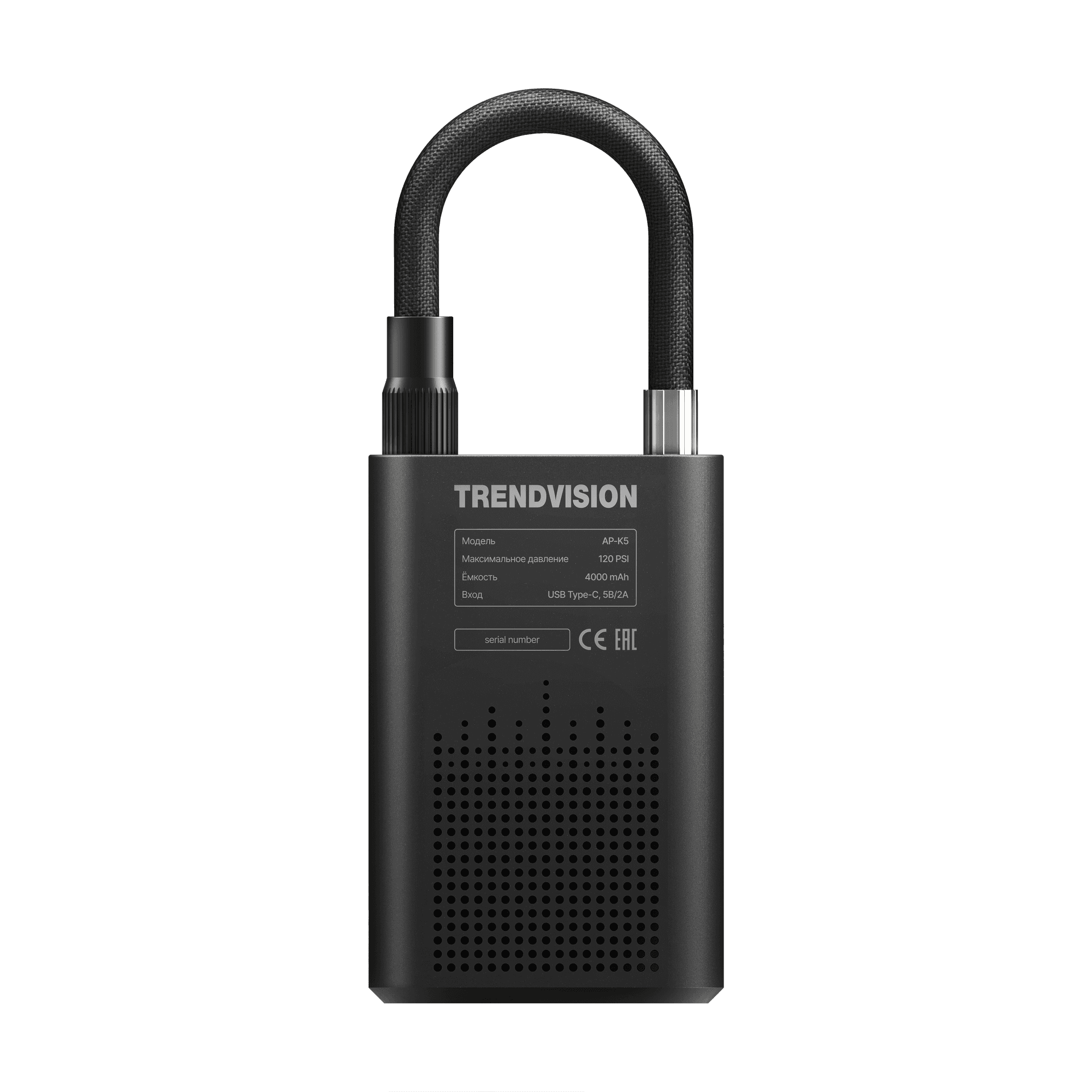 TrendVision AP-K5 — это компактный беспроводной компрессор с встроенным аккумулятором ёмкостью 4000 мАч. Устройство также может использоваться как внешний аккумулятор для зарядки мобильных гаджетов. Модель оснащена LED-фонарём с несколькими режимами работы и информативным дисплеем для точного контроля давления. При достижении заданного значения компрессор автоматически прекращает подачу воздуха. Максимальное создаваемое давление — 120 PSI.