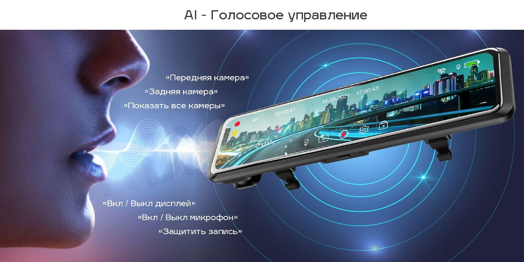 Умная система TrendVision MR-4K позволяет управлять самыми главными функциями устройства, не прикасаясь к нему. Голосовое управление запрограммировано на команды: «Задняя камера», «Передняя камера», «Обе камеры на экране», «Вкл/Выкл микрофон», «Вкл/Выкл дисплей», «Защита файла».