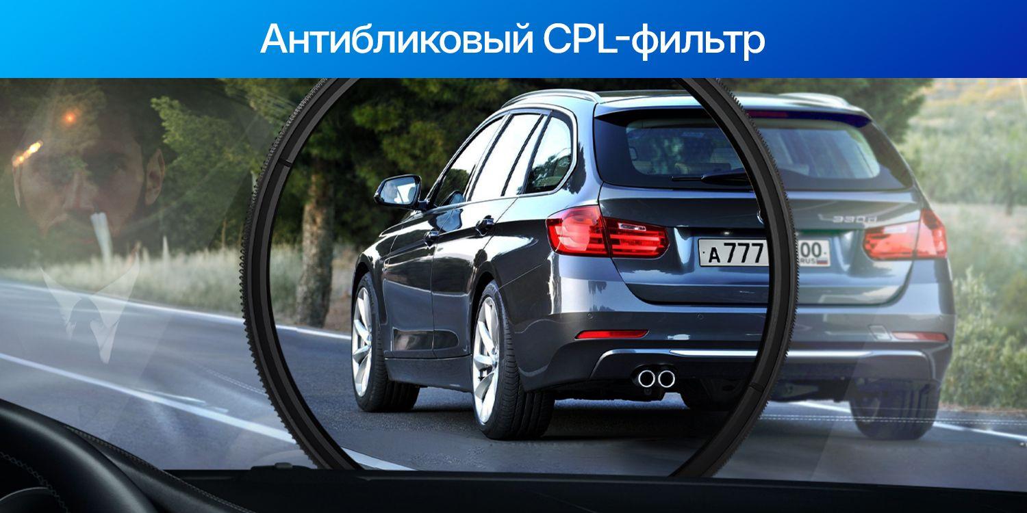 Вместе с устройством поставляется антибликовый CPL-фильтр, который эффективно устраняет солнечные блики и отражения от лобового стекла. Благодаря этому изображение становится чище и контрастнее, а все детали дорожной обстановки фиксируются максимально отчётливо даже при сложных условиях освещения