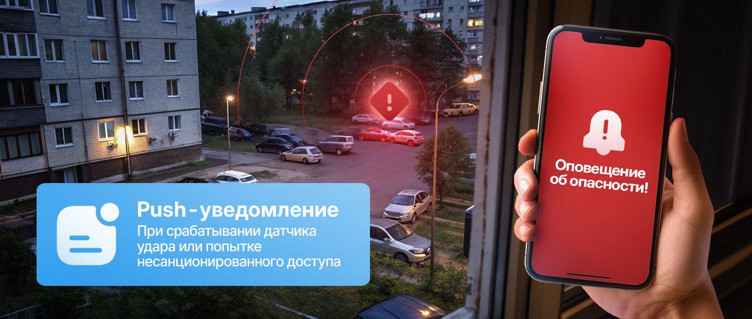 Система отправляет моментальные push-уведомления на смартфон владельца при срабатывании датчика удара или попытке несанкционированного доступа.
