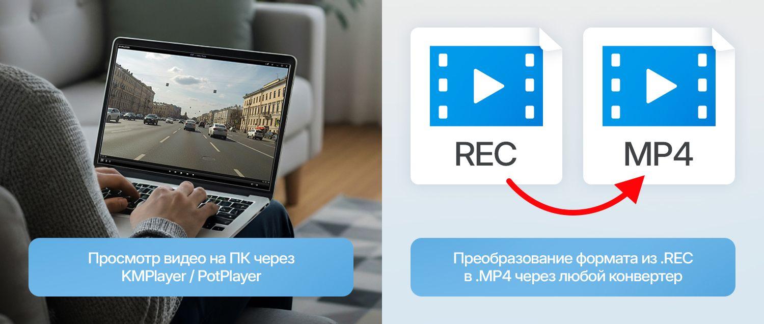 Для воспроизведения файлов на компьютере необходимо использовать специализированные видеоплееры (например, KMPlayer или PotPlayer). Для преобразование видеофайла с расширением .rec в другие форматы (.avi, .mp4 и др) можно воспользоваться бесплатными онлайн-приложениями для конвертации видео (например, video-converter.com) (не является рекомендацией!)