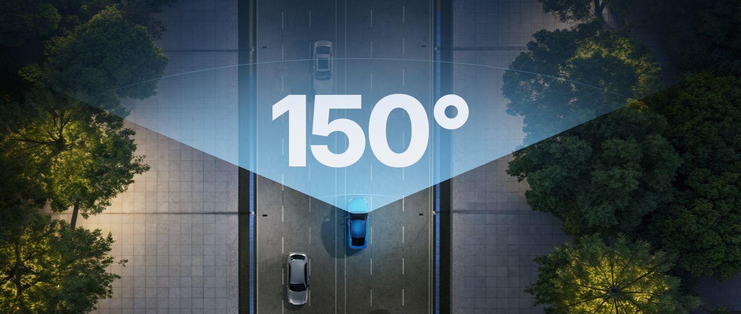 Угол обзора 150° у камеры обеспечивает съёмку всего, что происходит перед автомобилем.