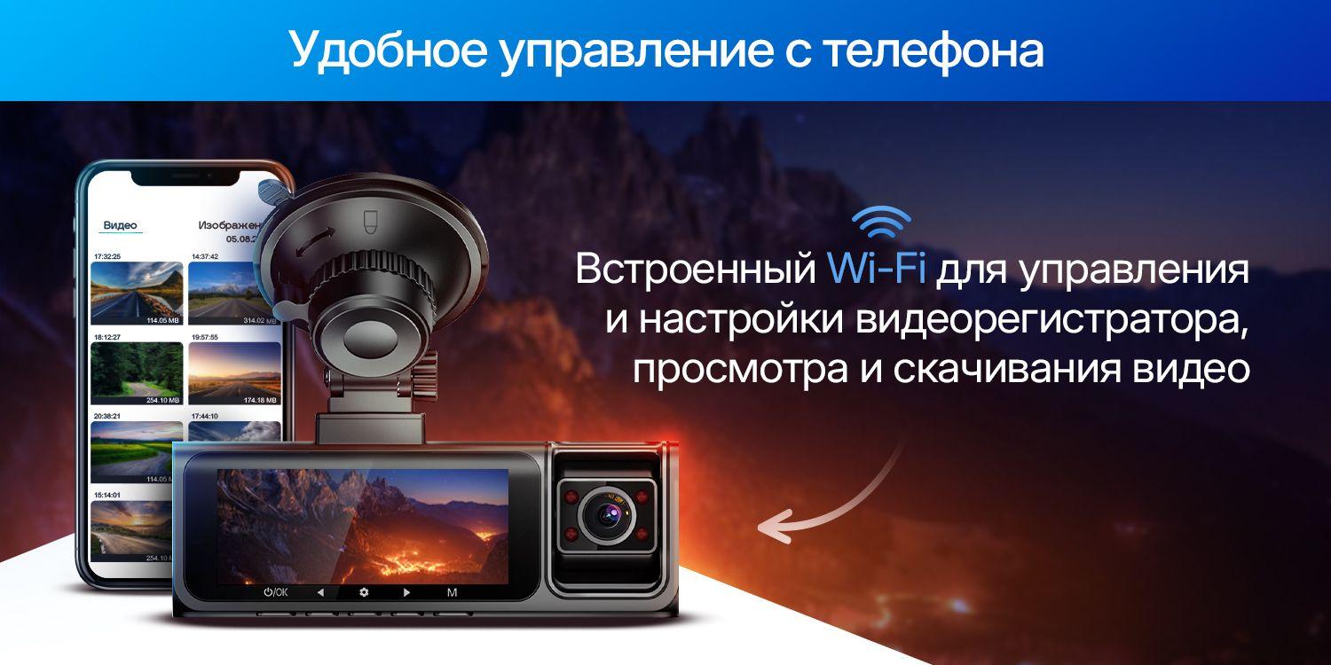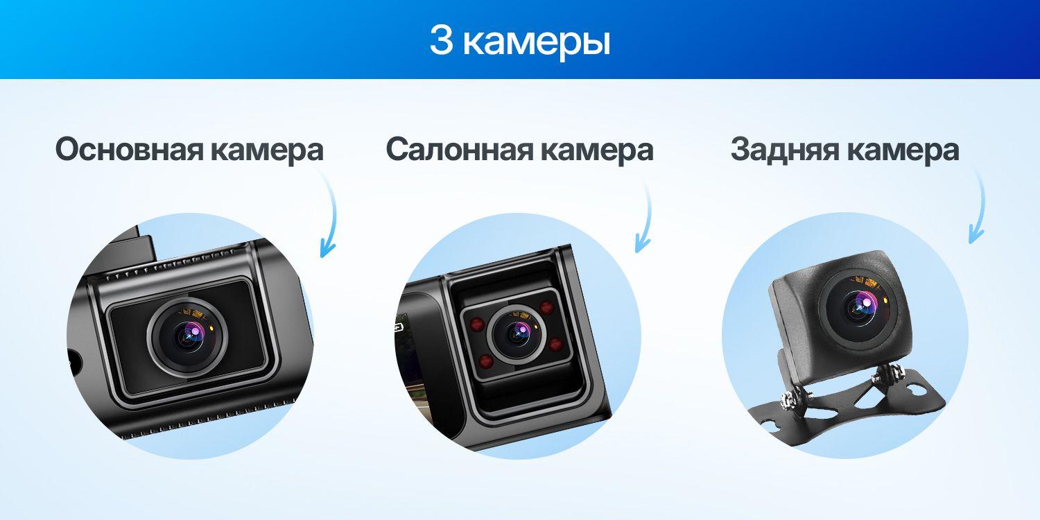 Угол обзора встроенных камер составляет 170° у фронтальной и 170° у салонной, благодаря чему регистратор охватывает широкий сектор перед автомобилем и полностью фиксирует происходящее внутри салона. Выносная задняя камера с углом 120° записывает ситуацию позади автомобиля, включая соседние полосы и пешеходные зоны. Такой широкий охват обеспечивает максимально полную картину событий вокруг машины в любых дорожных условиях.