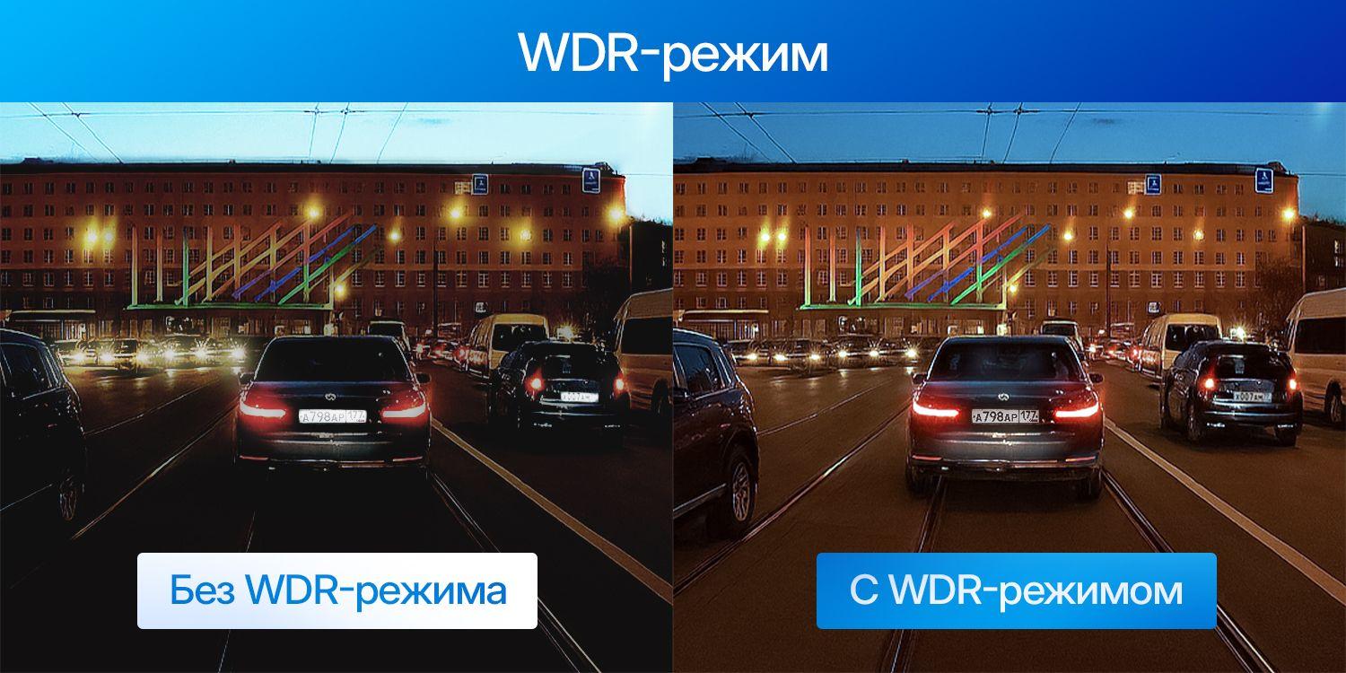 Аппаратная функция WDR обеспечивает корректную видимость деталей даже в сложных условиях съёмки. Она выравнивает яркость кадра при слишком сильном или недостаточном освещении и сглаживает резкие перепады света — например, при въезде в тёмный тоннель или выезде на ярко освещённый участок дороги. Благодаря этому изображение остаётся информативным и читаемым в любой ситуации.