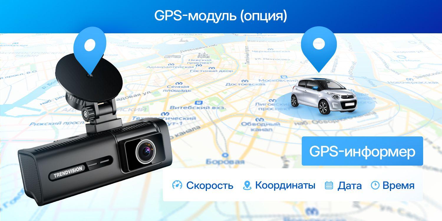 Встроенный GPS-модуль фиксирует дату, время, скорость и координаты.