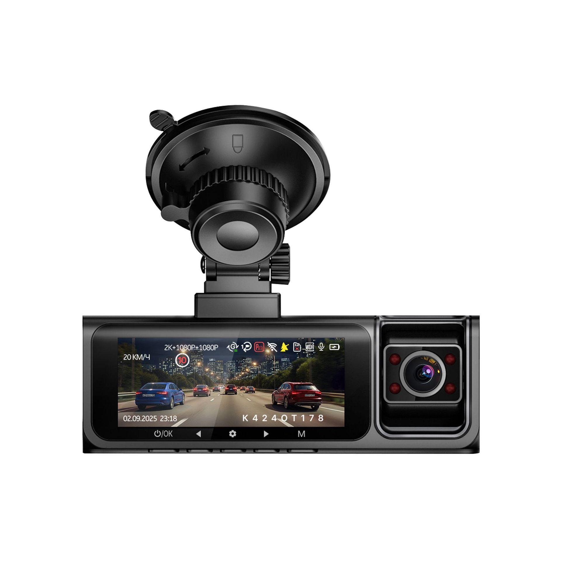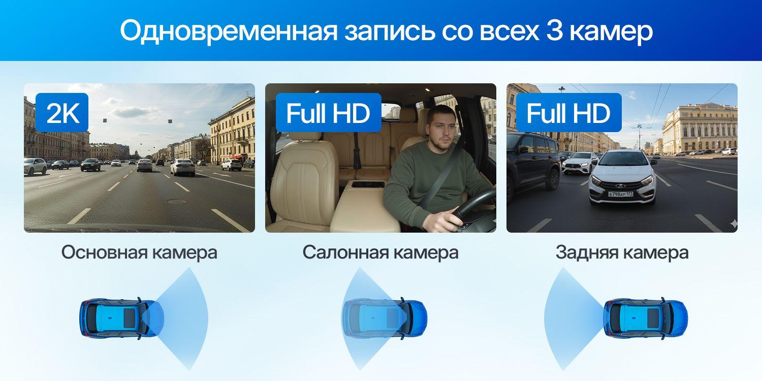 При подключении задней камеры устройство автоматически переключает разрешение фронтальной и салонной камер на 2K и Full HD, сохраняя высокую детализацию и стабильное качество записи на всех трёх каналах.