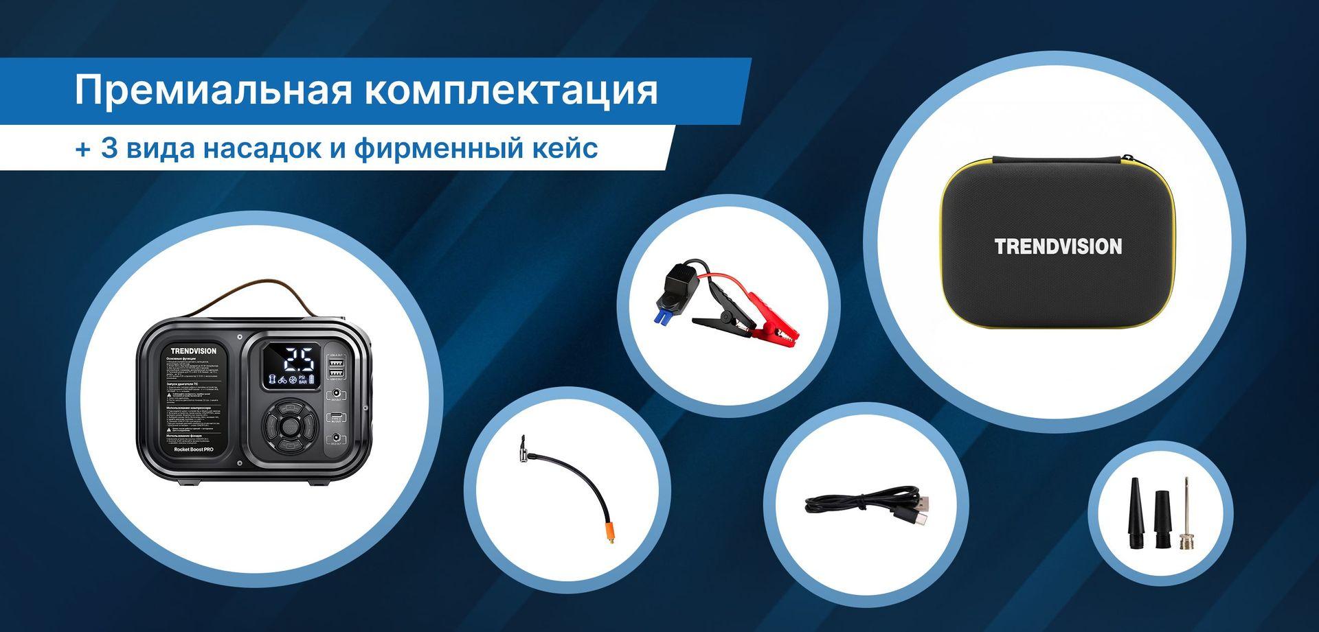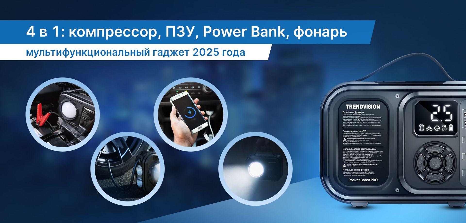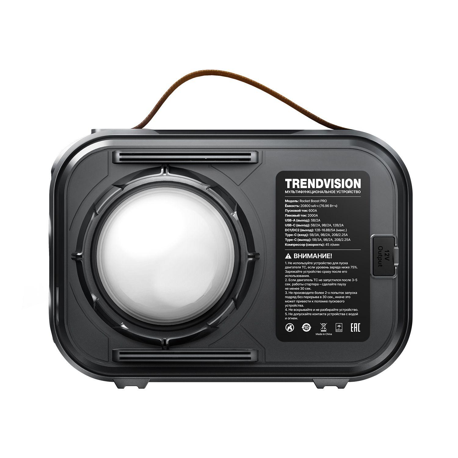 TrendVision Rocket Boost PRO — это универсальное устройство формата «4 в 1», объединяющее пуско-зарядное устройство, беспроводной компрессор, powerbank и фонарик.