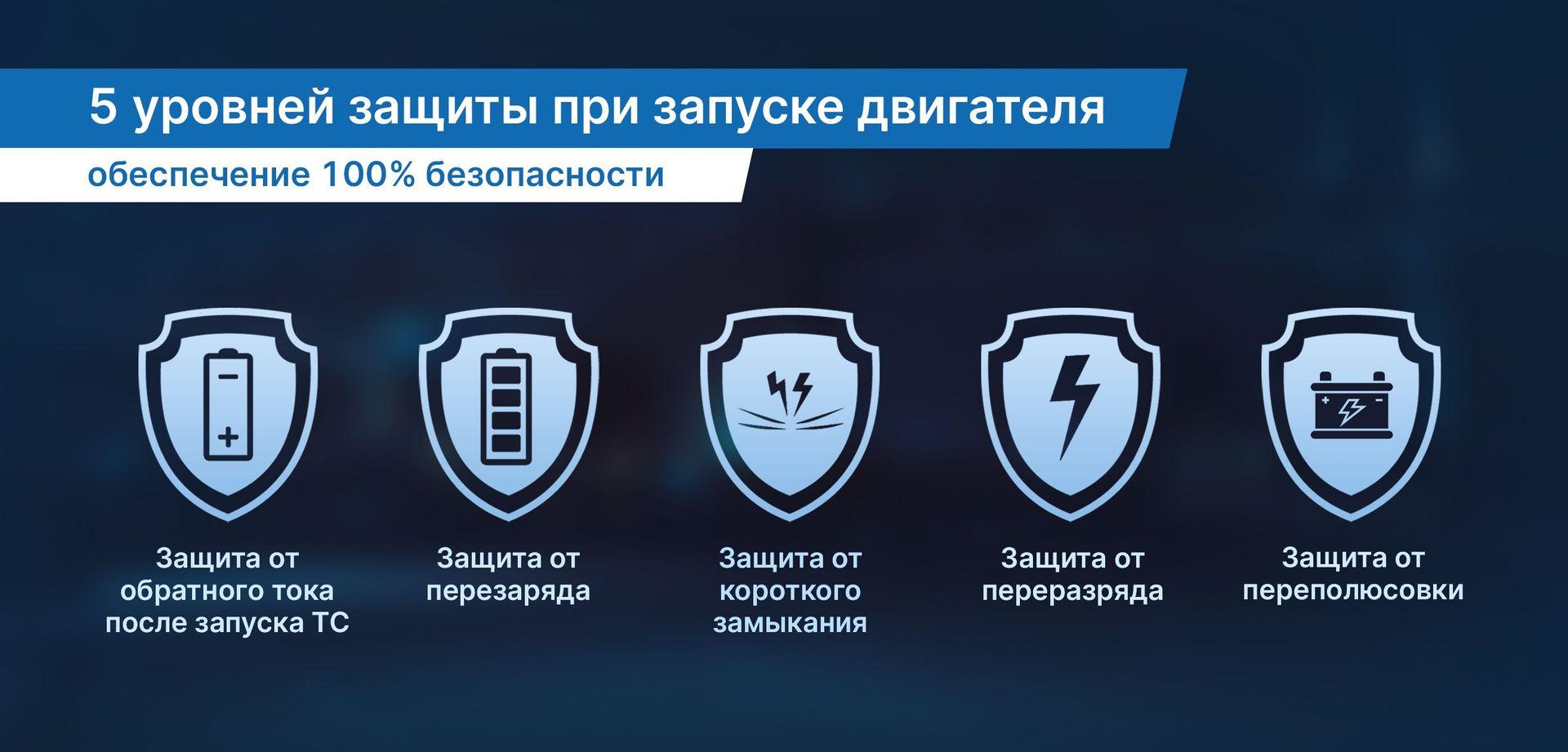 Система безопасности включает пять ступеней защиты: от короткого замыкания, перегрузки, перенапряжения, перегрева и обратной полярности. Такой комплекс исключает риск повреждения бортовой сети автомобиля и самого устройства, обеспечивая полностью безопасный запуск в любых условиях.