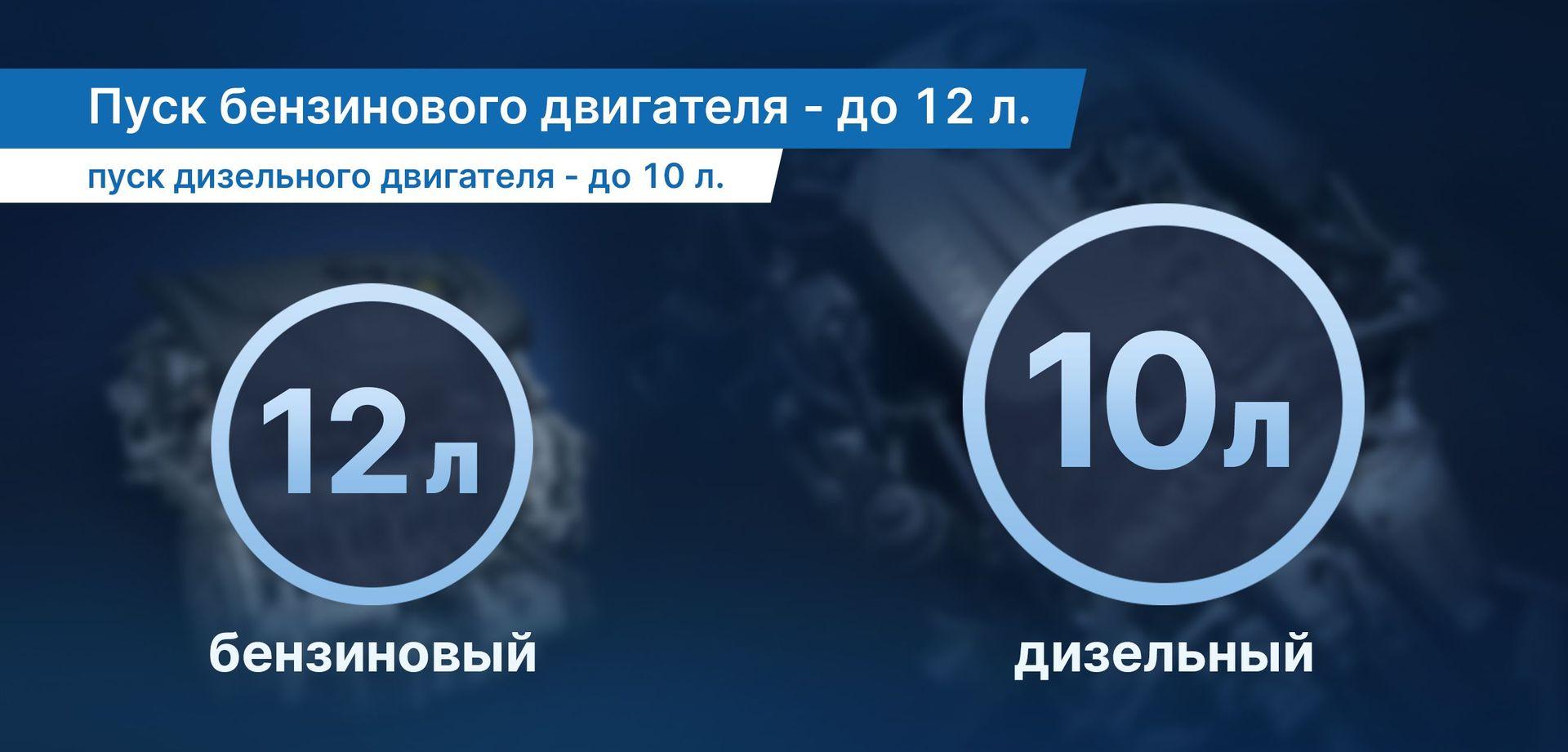 - Запуск бензиновых двигателей до 12 л и дизельных до 10 л.