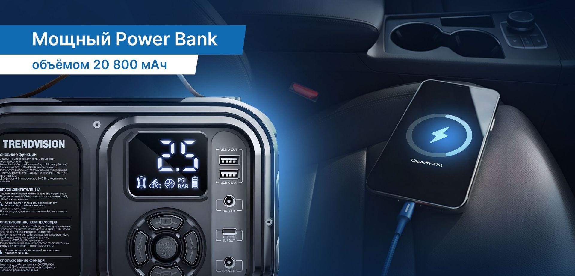Оснащённый аккумулятором ёмкостью 20 800 мА·ч, он способен запустить двигатель практически любого транспортного средства — даже при полностью разряженной батарее или в условиях тяжёлого зимнего пуска. Встроенный компрессор позволяет быстро и без усилий подкачать колёса автомобиля, а функция powerbank даёт возможность зарядить смартфоны, планшеты и другую электронику в дороге.
