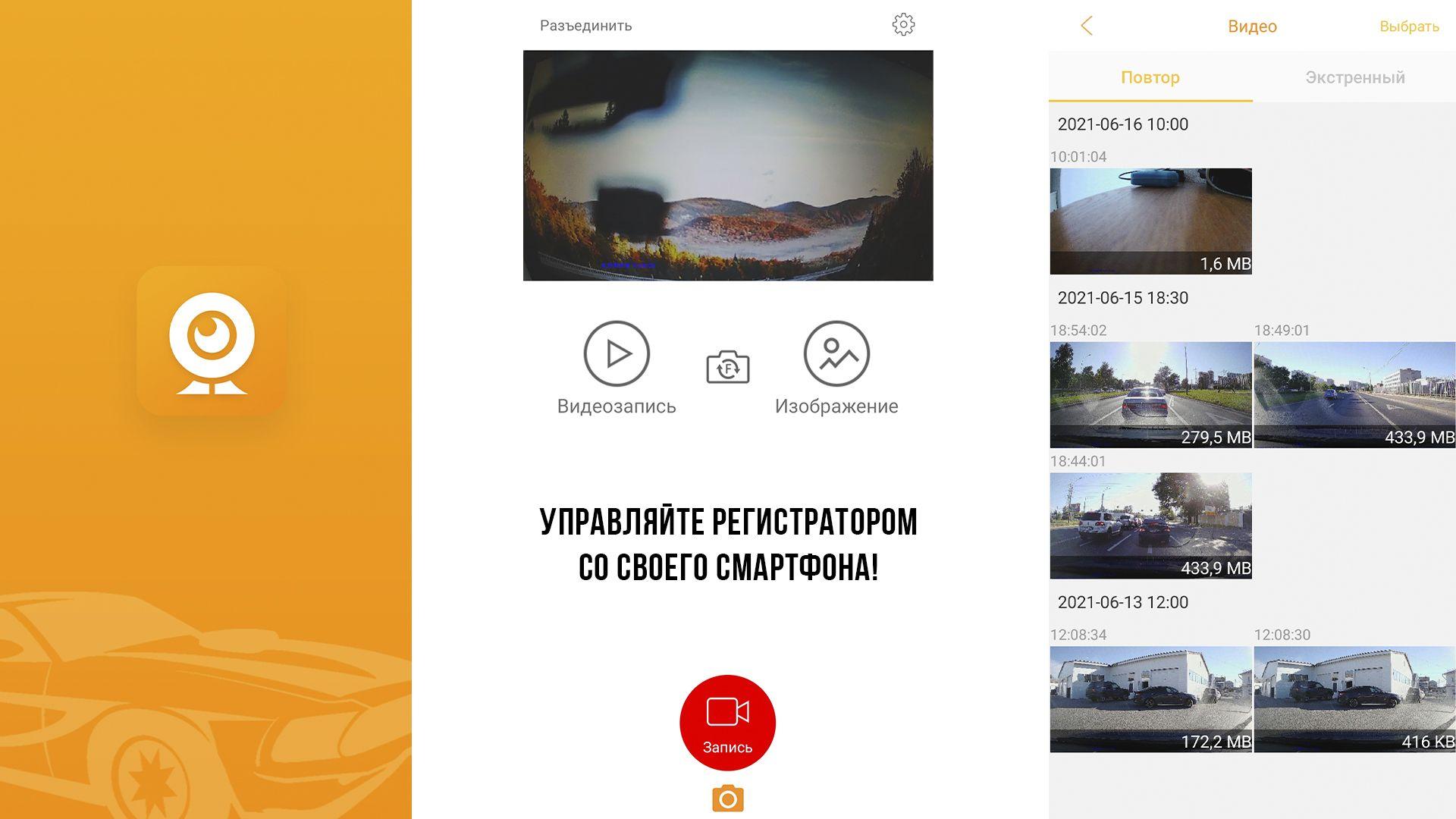 Управляйте регистратором с помощью вашего смартфон! Загрузите с PlayMarket или AppStore приложение RoadCam и наслаждайтесь удобством без проводов.