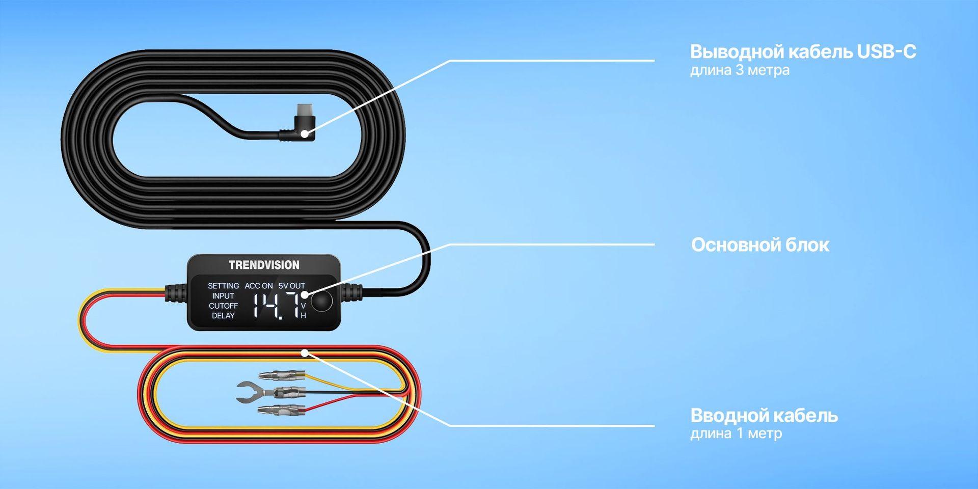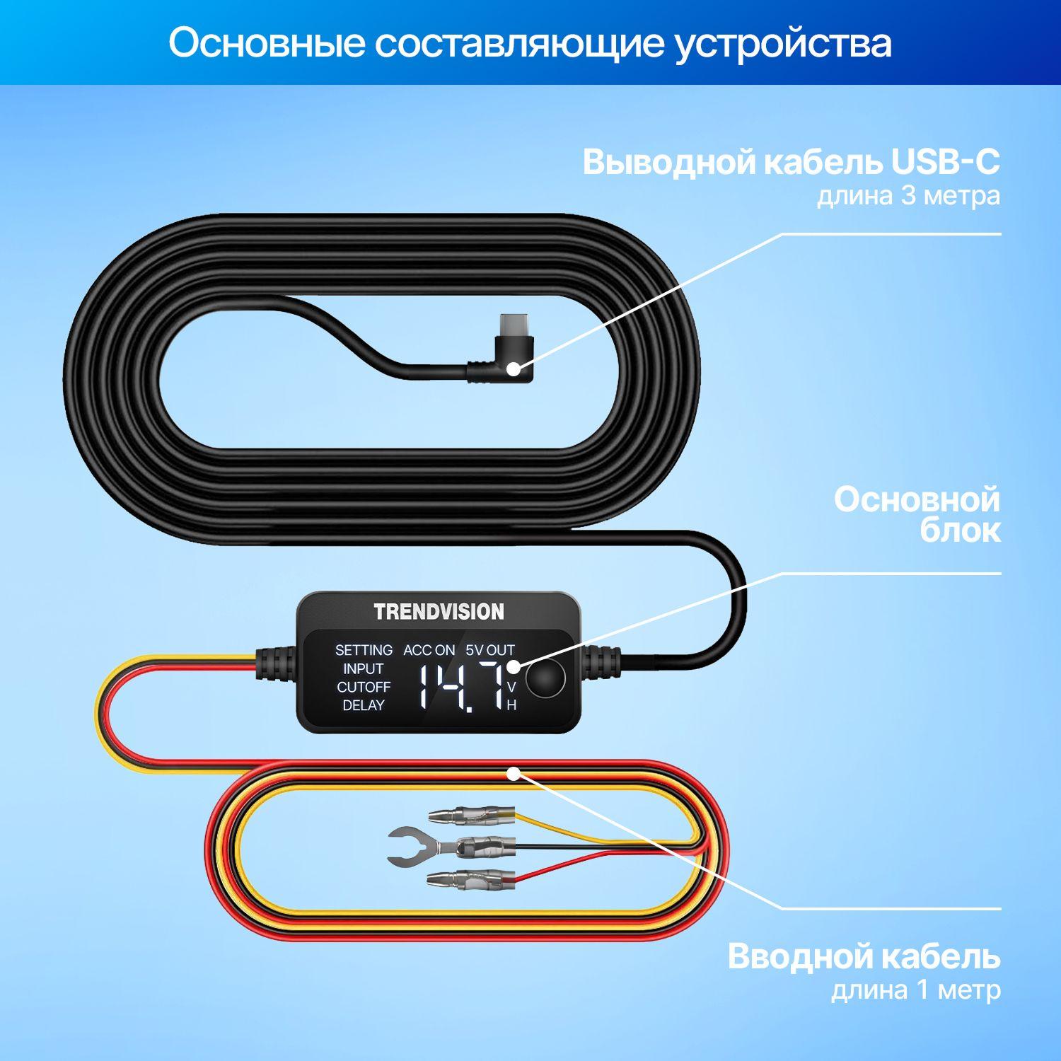 TrendVision HardWare Kit 2.0 (Pro Edition) — профессиональный кабель прямого подключения нового поколения для видеорегистраторов и комбо-устройств TrendVision с разъёмом USB Type-C. Предназначен для подключения оборудования напрямую к бортовой сети автомобиля и организации полностью скрытой установки без использования прикуривателя.