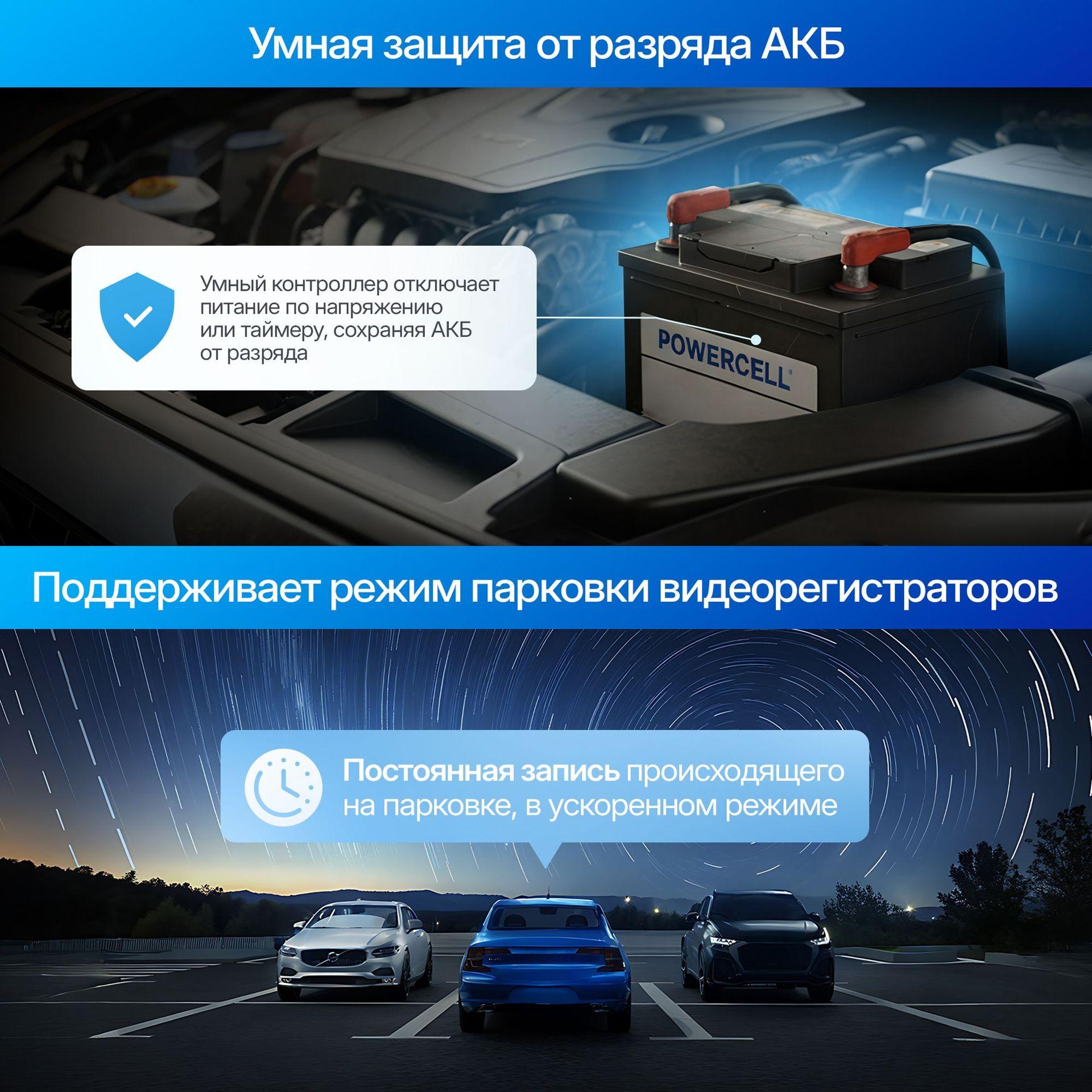 Комплект обеспечивает постоянное питание видеорегистратора и полноценную работу парковочного режима, включая круглосуточную съёмку 24/7 в режиме Таймлапс (при поддержке данной функции самим устройством). Встроенная система защиты контролирует состояние аккумулятора автомобиля и автоматически отключает питание при снижении напряжения до критического уровня или по заданному таймеру, предотвращая полный разряд АКБ.