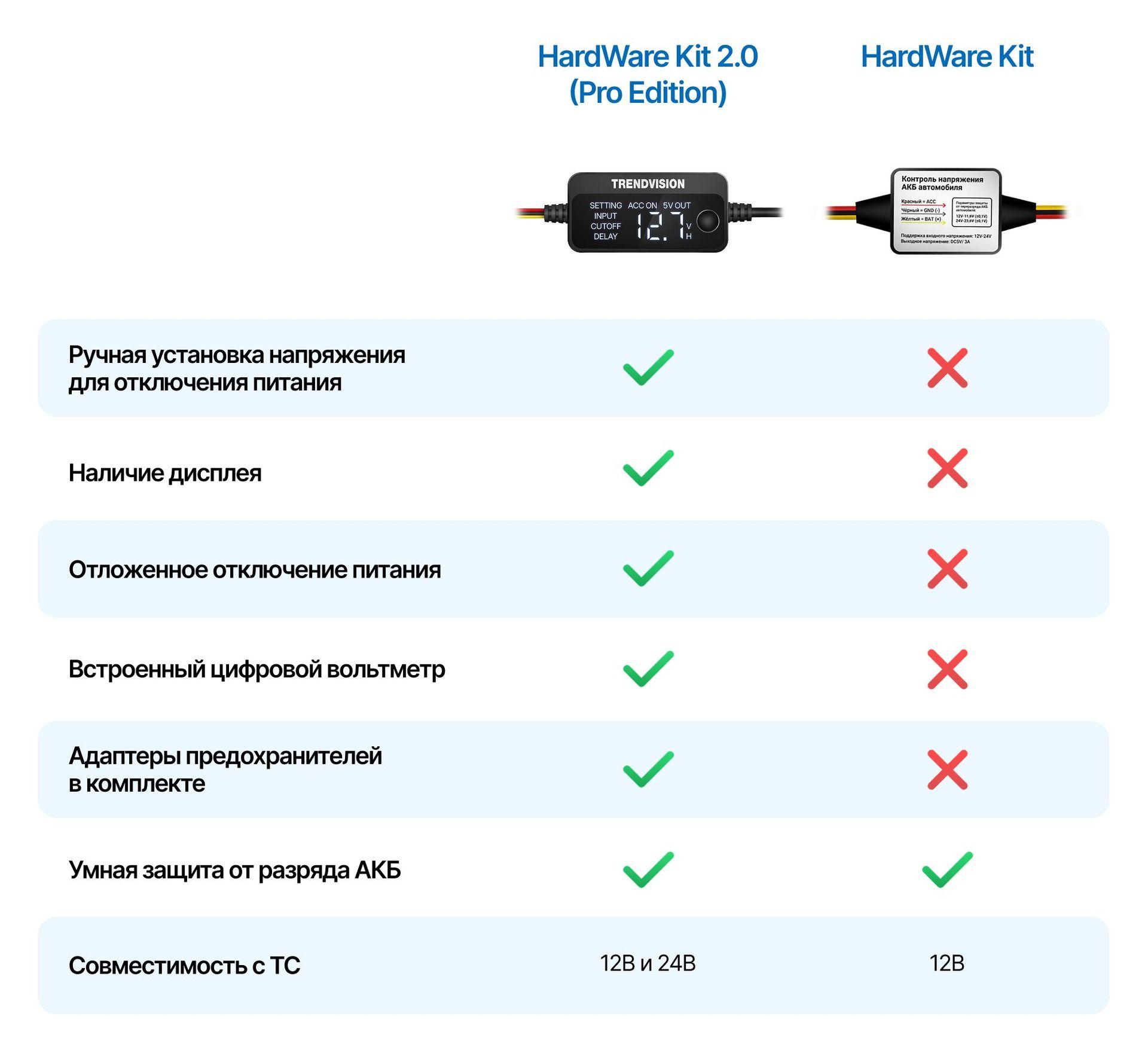 Версия Pro Edition оснащена встроенным дисплеем, который позволяет наглядно контролировать напряжение бортовой сети и удобно настраивать параметры работы. В комплект сразу входят адаптеры предохранителей, что упрощает установку и делает её универсальной для разных автомобилей. Кабель совместим как с легковыми авто на 12 В, так и с коммерческим транспортом на 24 В, тогда как стандартный HardWare Kit рассчитан только на 12 В.