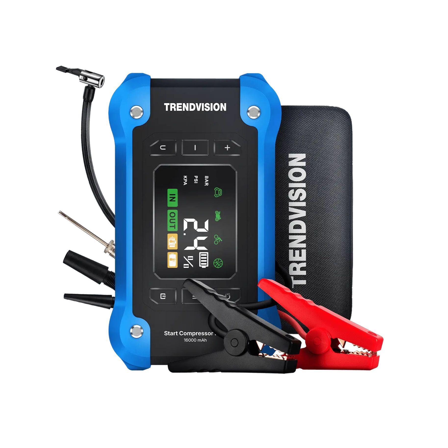 TrendVision Start Compressor PRO — это универсальное устройство «четыре в одном», сочетающее в себе пуско-зарядное устройство, беспроводной компрессор, powerbank и фонарик. Оснащённый ёмким аккумулятором на 16 000 мАч, он способен запускать двигатель любого транспортного средства при полностью разряженной батарее или в условиях сложного зимнего пуска. Помимо этого, прибор позволяет быстро и без лишних усилий подкачать колёса автомобиля благодаря встроенному компрессору, а также зарядить смартфоны, планшеты и другую электронику, используя функцию внешнего аккумулятора. Дополнительным преимуществом является встроенный фонарик, который выручит в дороге в тёмное время суток.